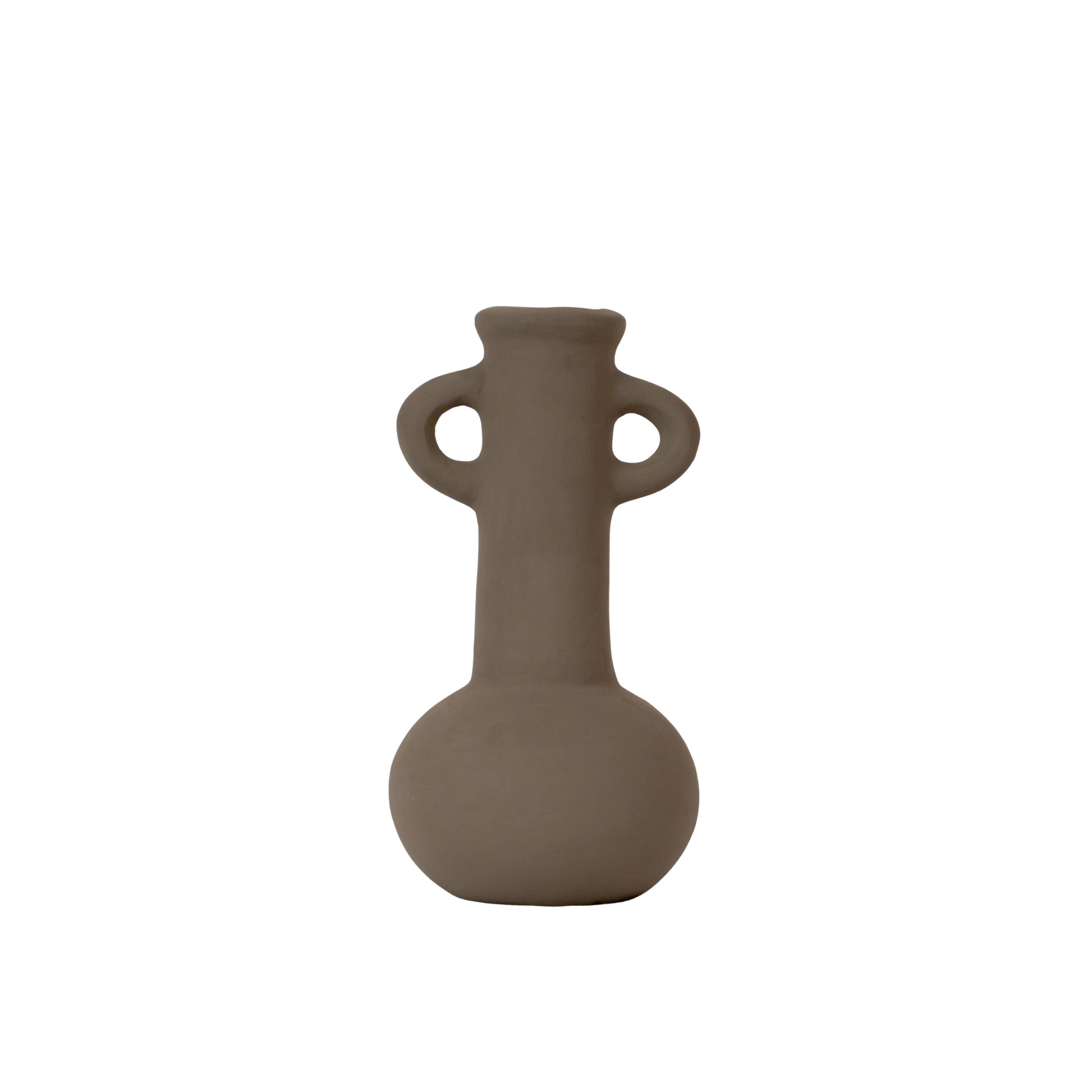 This sculptural terracotta vase features a striking twin-handle design with a long neck and rounded base, creating a bold silhouette that blends tradition with contemporary form. Handcrafted by artisans in Indonesia, it is finished in a soft, earthy tone that highlights the natural texture of the clay.